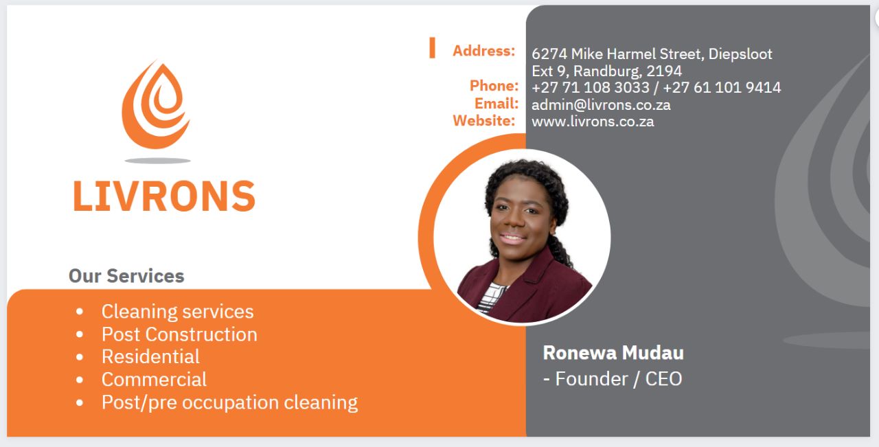 Livrons Enterprise is a cleaning company founded by Ronewa Mudau,a single mother of 2 boys.I lost my job as a domestic worker and left my abusive marriage and started this company.